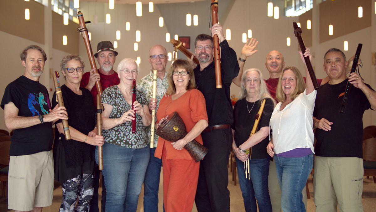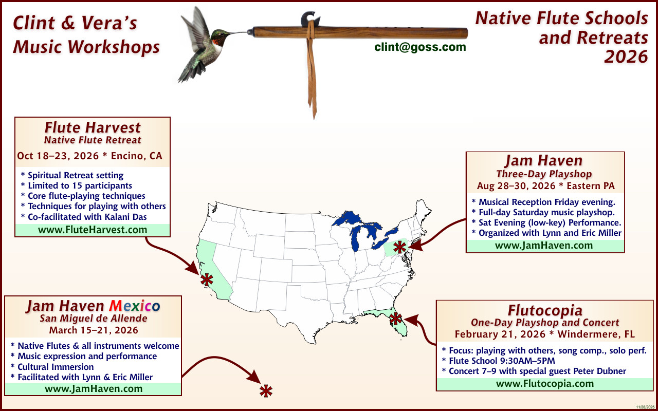 is a one-day workshop of supportive music making that focuses on Native American flutes, but is open to all music makers. Facilitated by Clint and Vera with a special appearance by Peter Dubner (who recorded many of the piano Jam Tracks backing tracks).